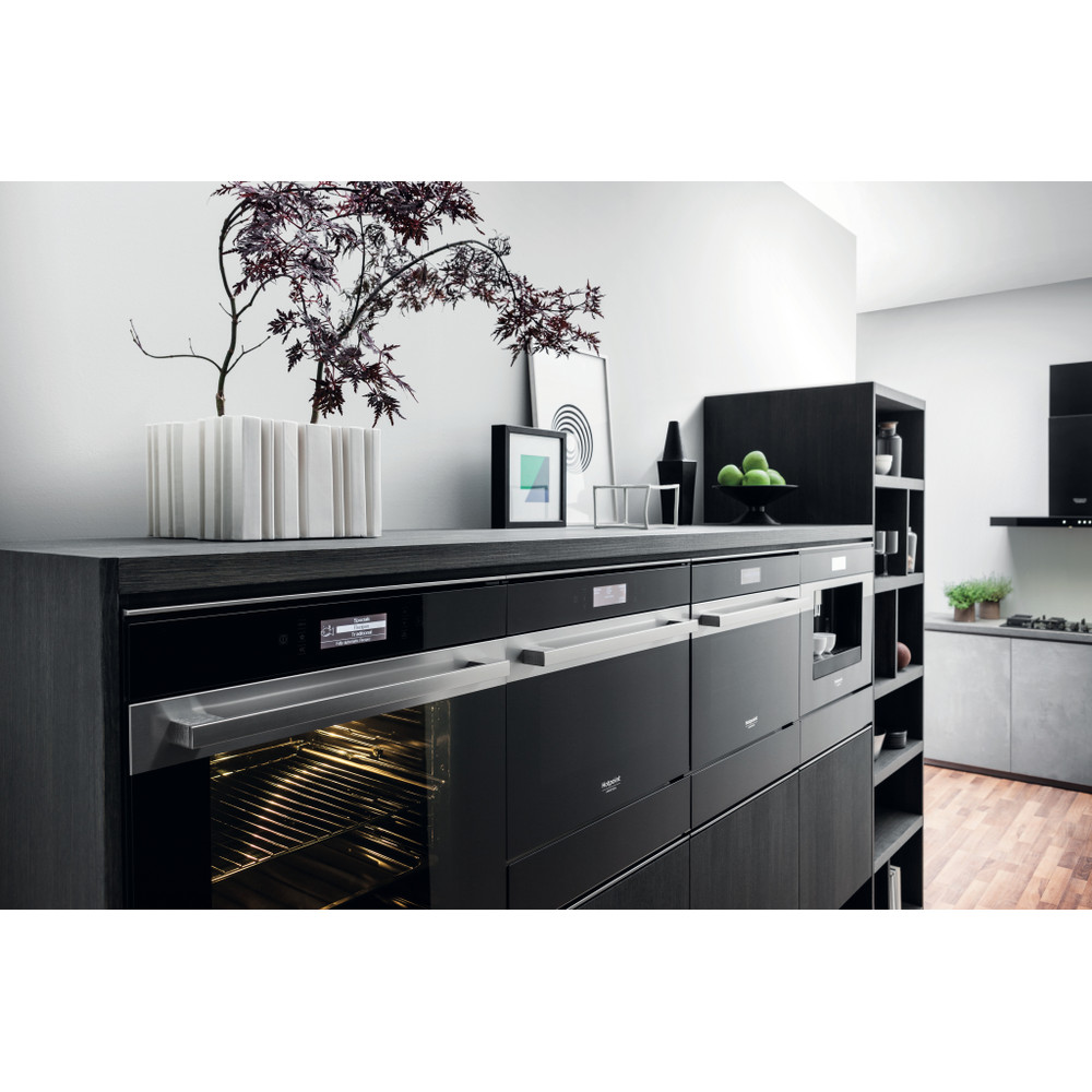 Características de este calientaplatos integrable Hotpoint: capacidad de hasta 16 litros. Temperatura ajustable entre 40 y 70 C para mantener caliente los platos. Mecanismo push-push para abrir el cajón, sin tirador.