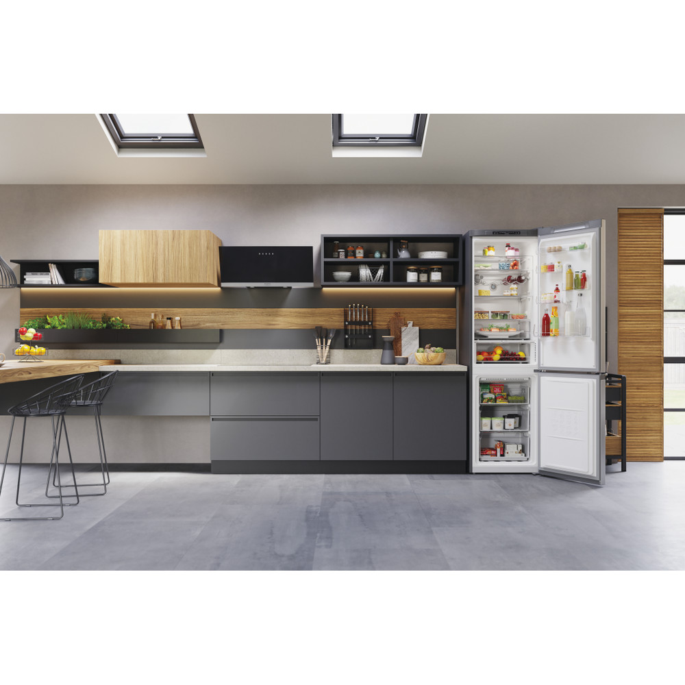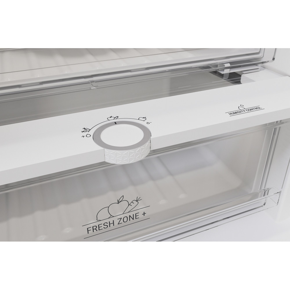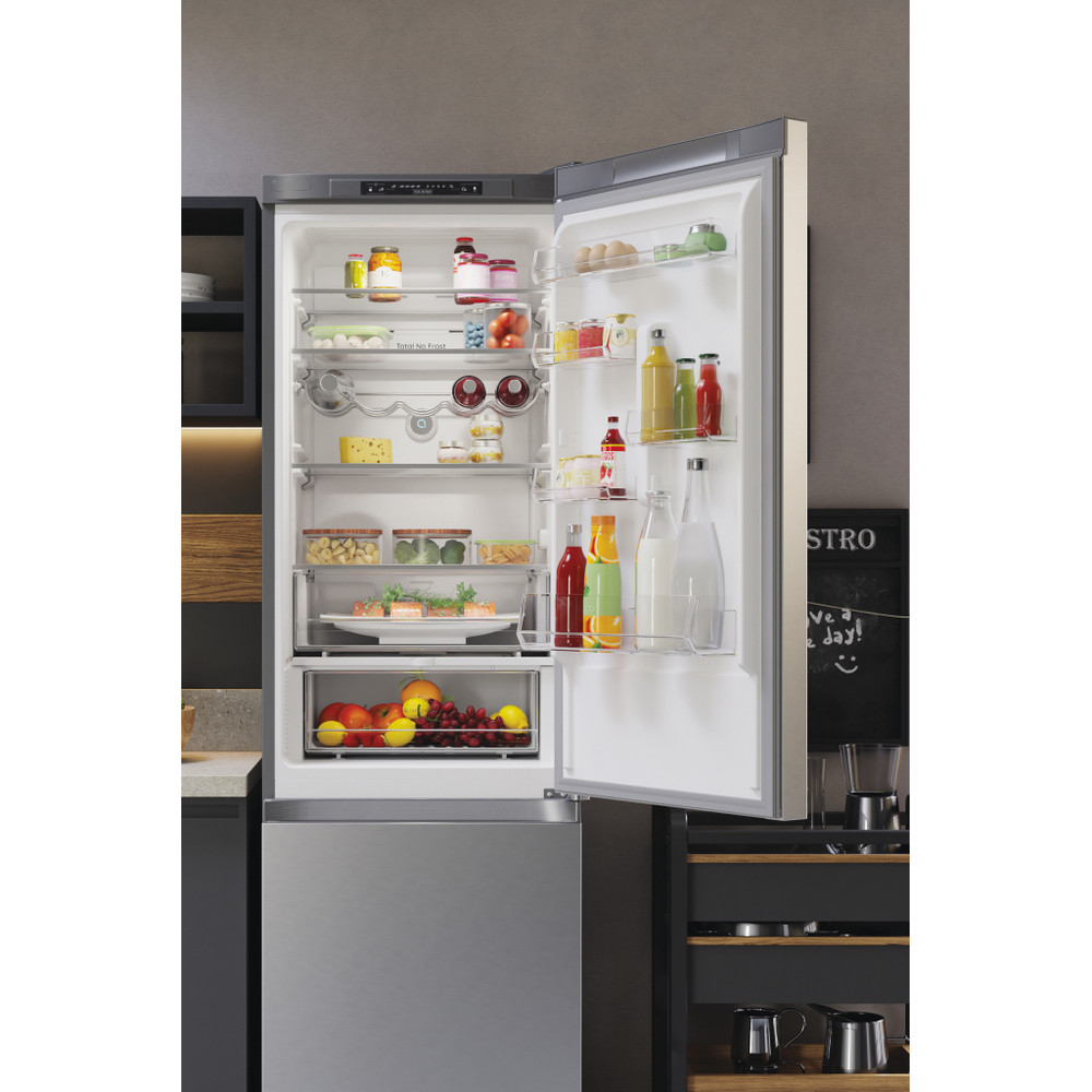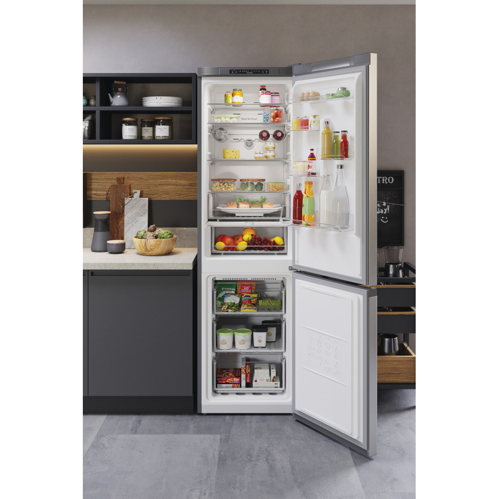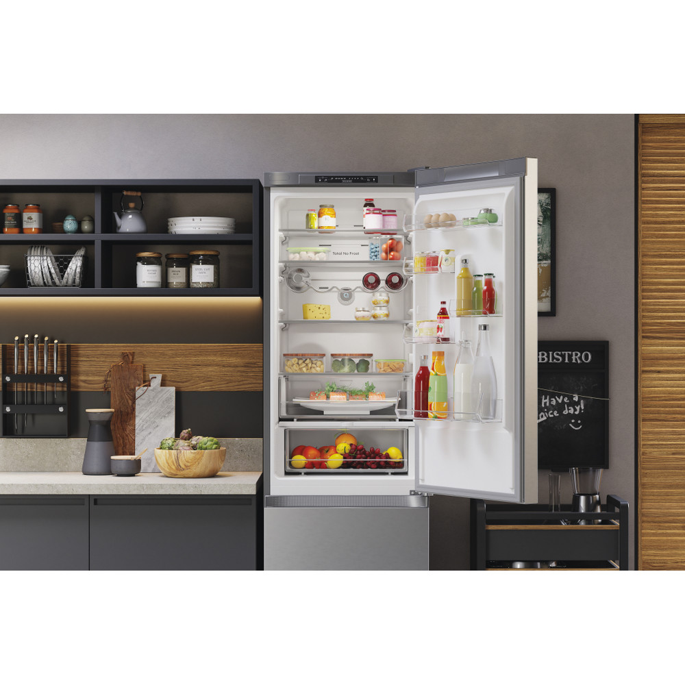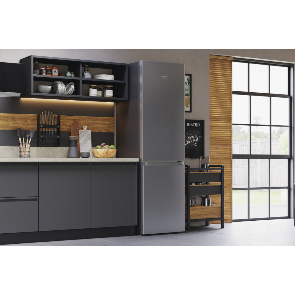 Este frigorífico combinado de libre instalación Hotpoint tiene: un aparato de altura para adaptarse a sus necesidades familiares. Sin escarcha, tecnología libre de escarcha, impide efectivamente la acumulación de hielo en su electrodoméstico, mediante la reducción de los niveles de humedad. Estantes de vidrio que proporcionan robustez. Cómodo balcón para almacenar de forma segura sus botellas.