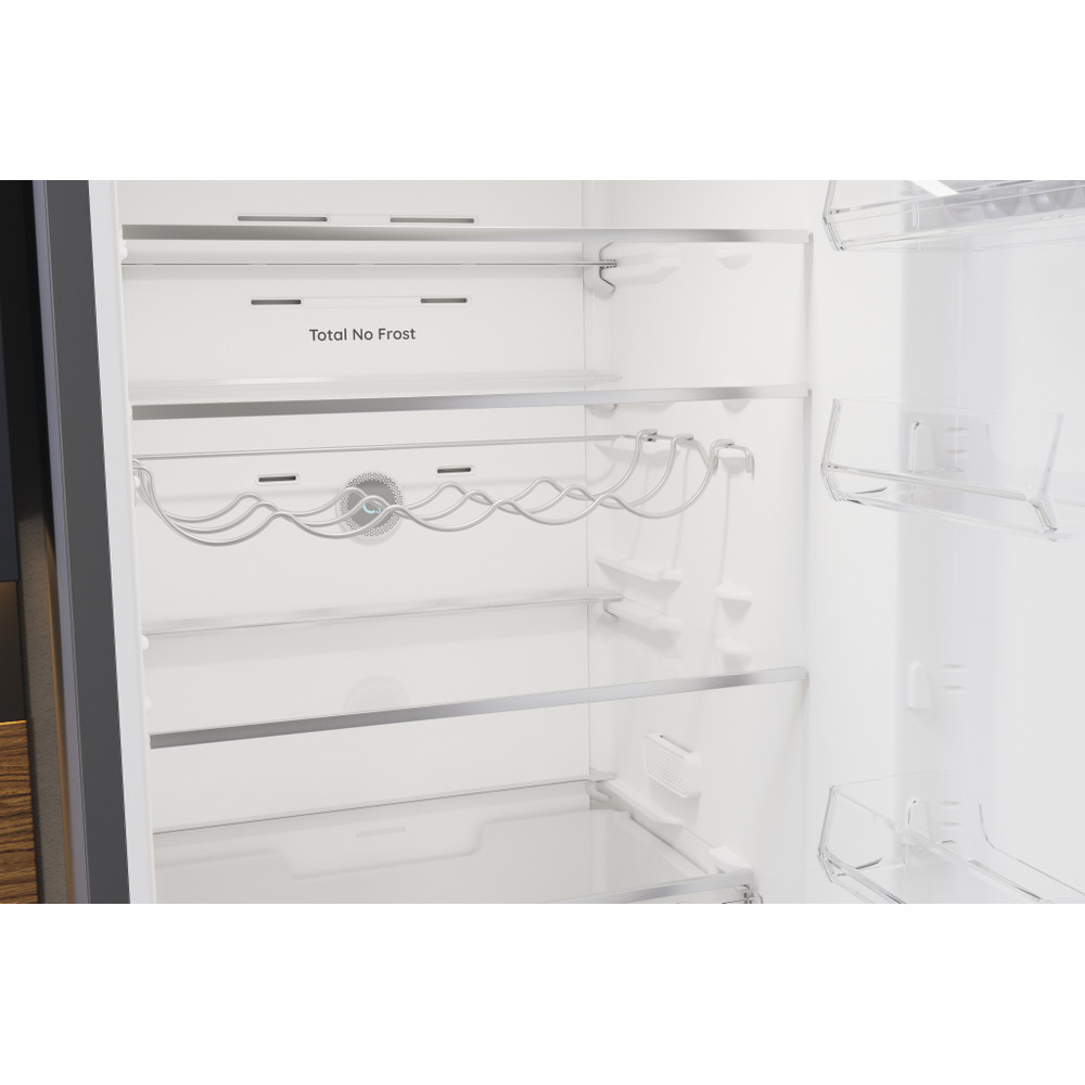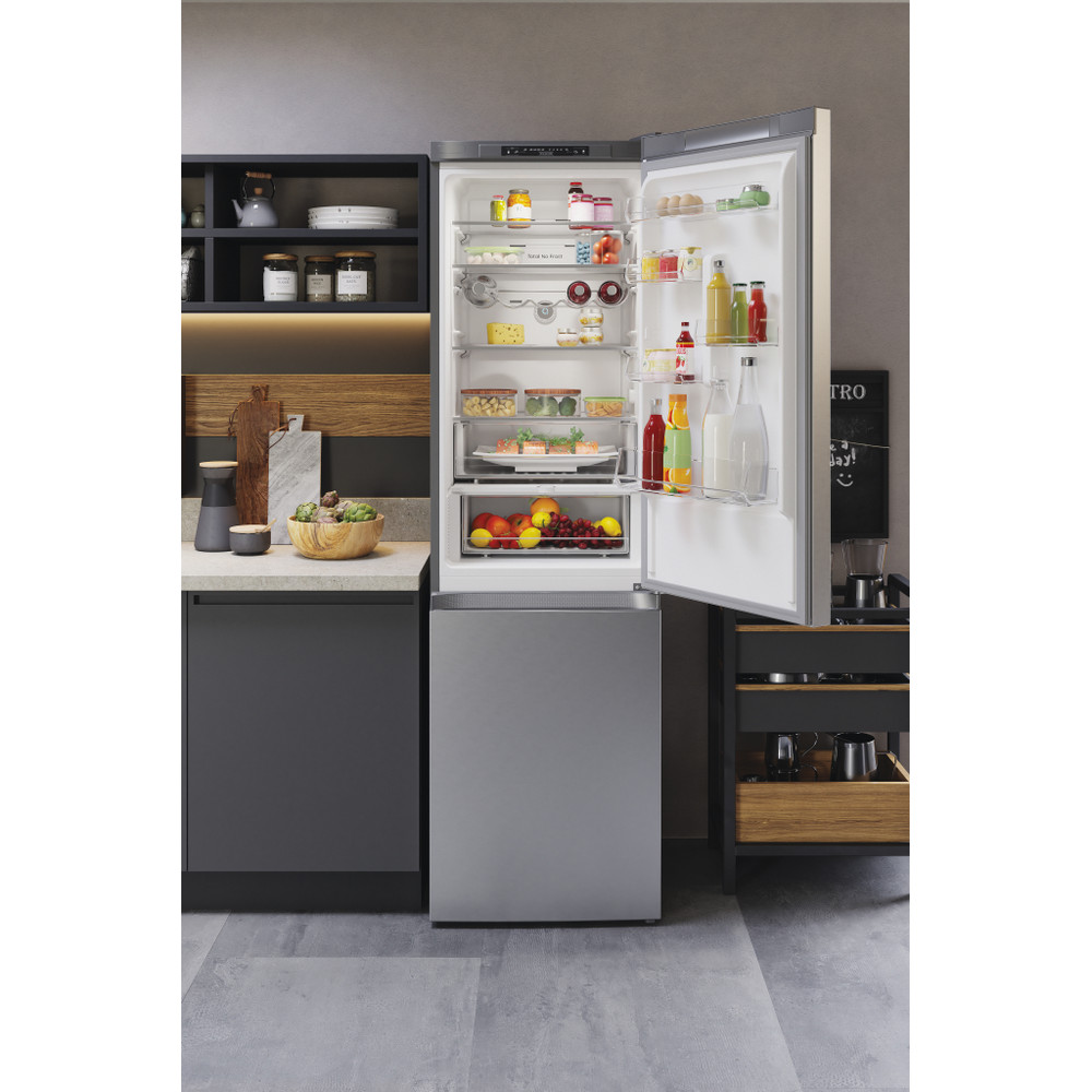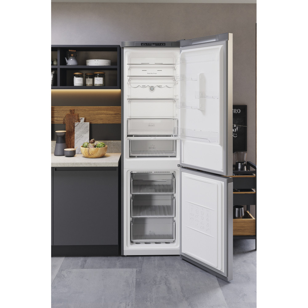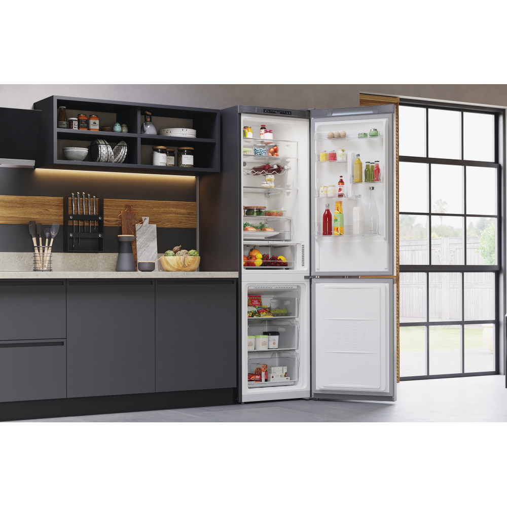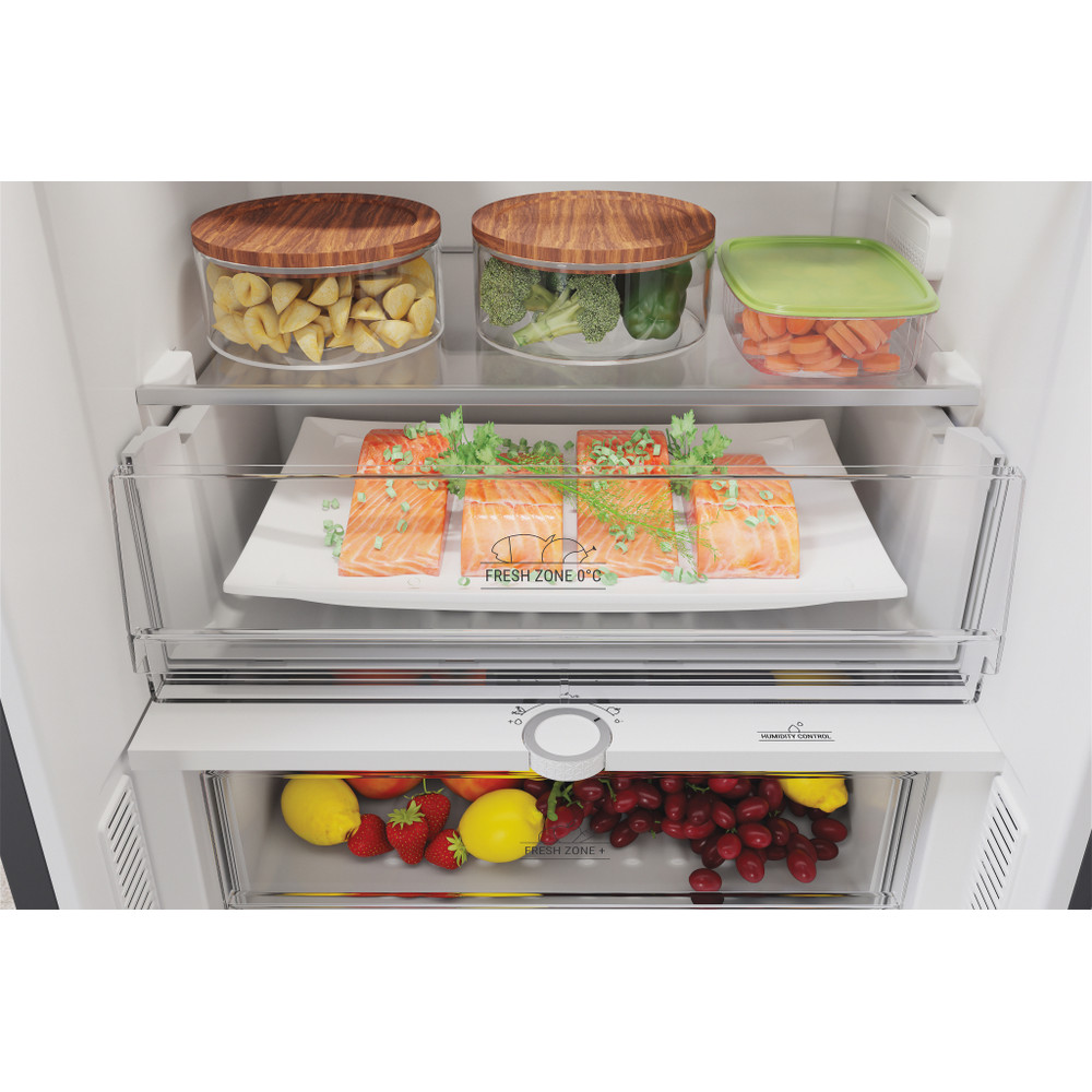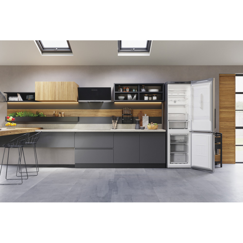 Este frigorífico combinado de libre instalación Hotpoint tiene: un aparato de altura para adaptarse a sus necesidades familiares. Sin escarcha, tecnología libre de escarcha, impide efectivamente la acumulación de hielo en su electrodoméstico, mediante la reducción de los niveles de humedad. Estantes de vidrio que proporcionan robustez. Cómodo balcón para almacenar de forma segura sus botellas.