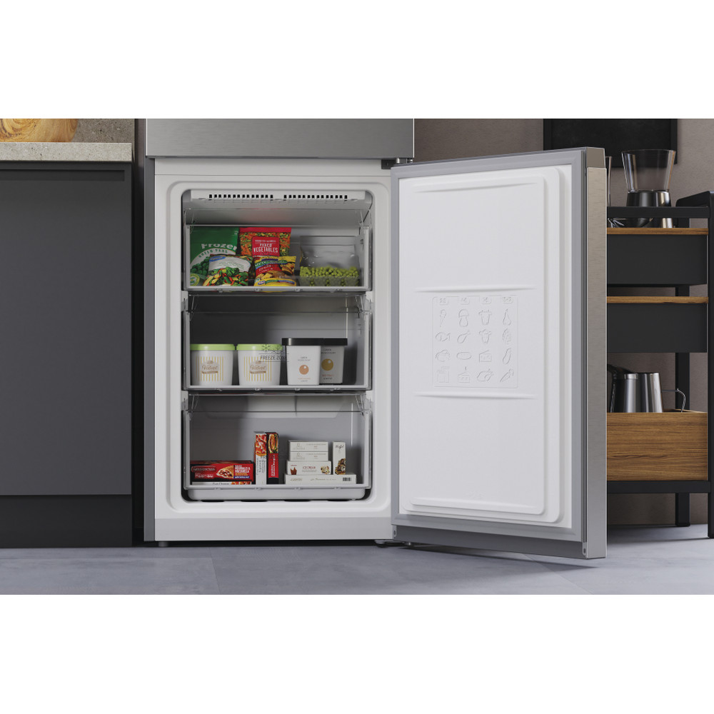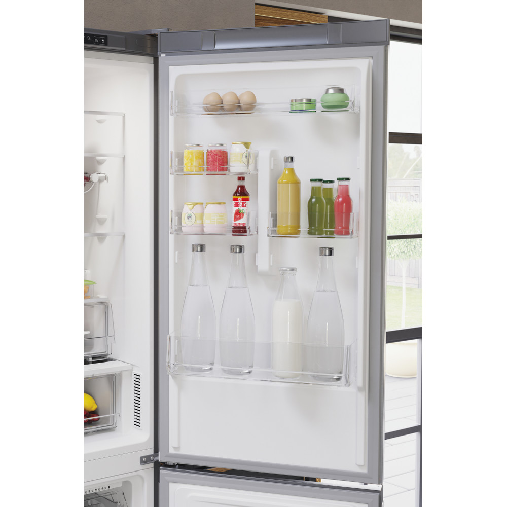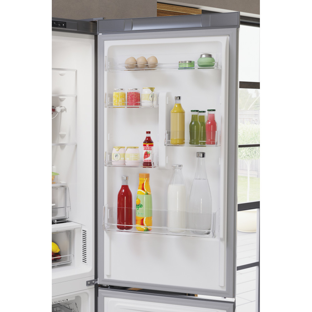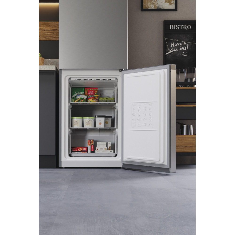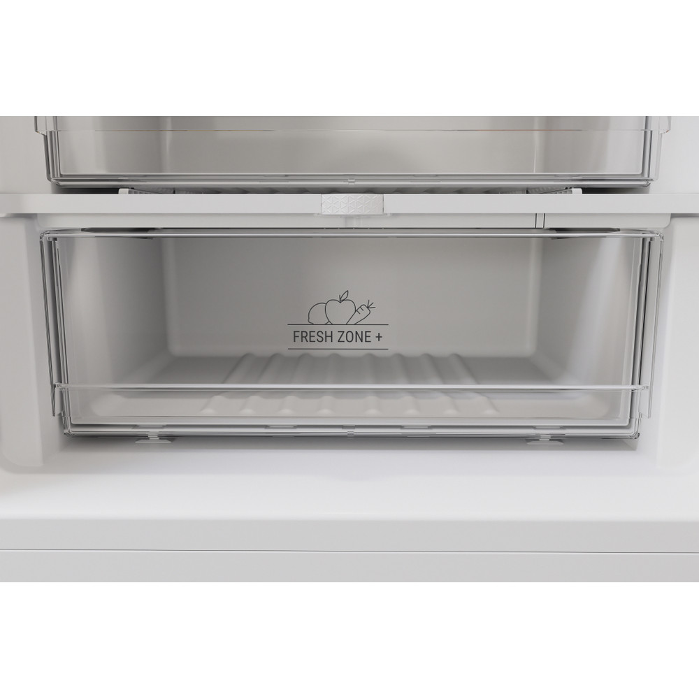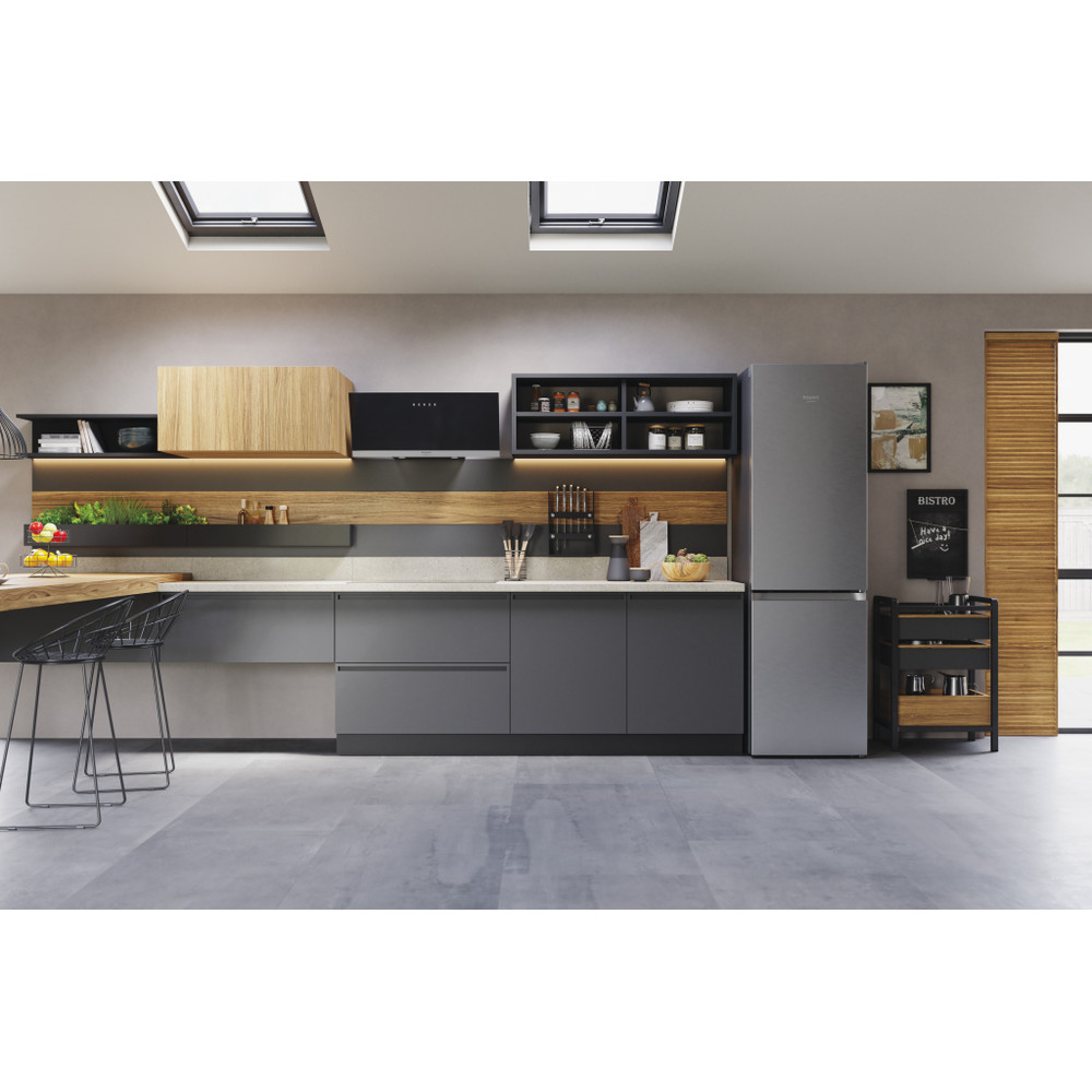 Este frigorífico combinado de libre instalación Hotpoint tiene: un aparato de altura para adaptarse a sus necesidades familiares. Sin escarcha, tecnología libre de escarcha, impide efectivamente la acumulación de hielo en su electrodoméstico, mediante la reducción de los niveles de humedad. Estantes de vidrio que proporcionan robustez. Cómodo balcón para almacenar de forma segura sus botellas.