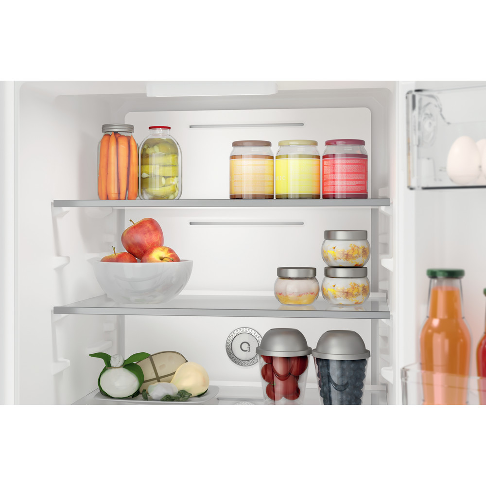 Este frigorífico combinado de integración Hotpoint tiene: color blanco Estantes de vidrio que proporcionan robustez. Un ventilador que proporciona un flujo suave y uniforme de aire en la cavidad de su frigorífico, para una mejor ventilación. Cómodo balcón para almacenar de forma segura sus botellas.